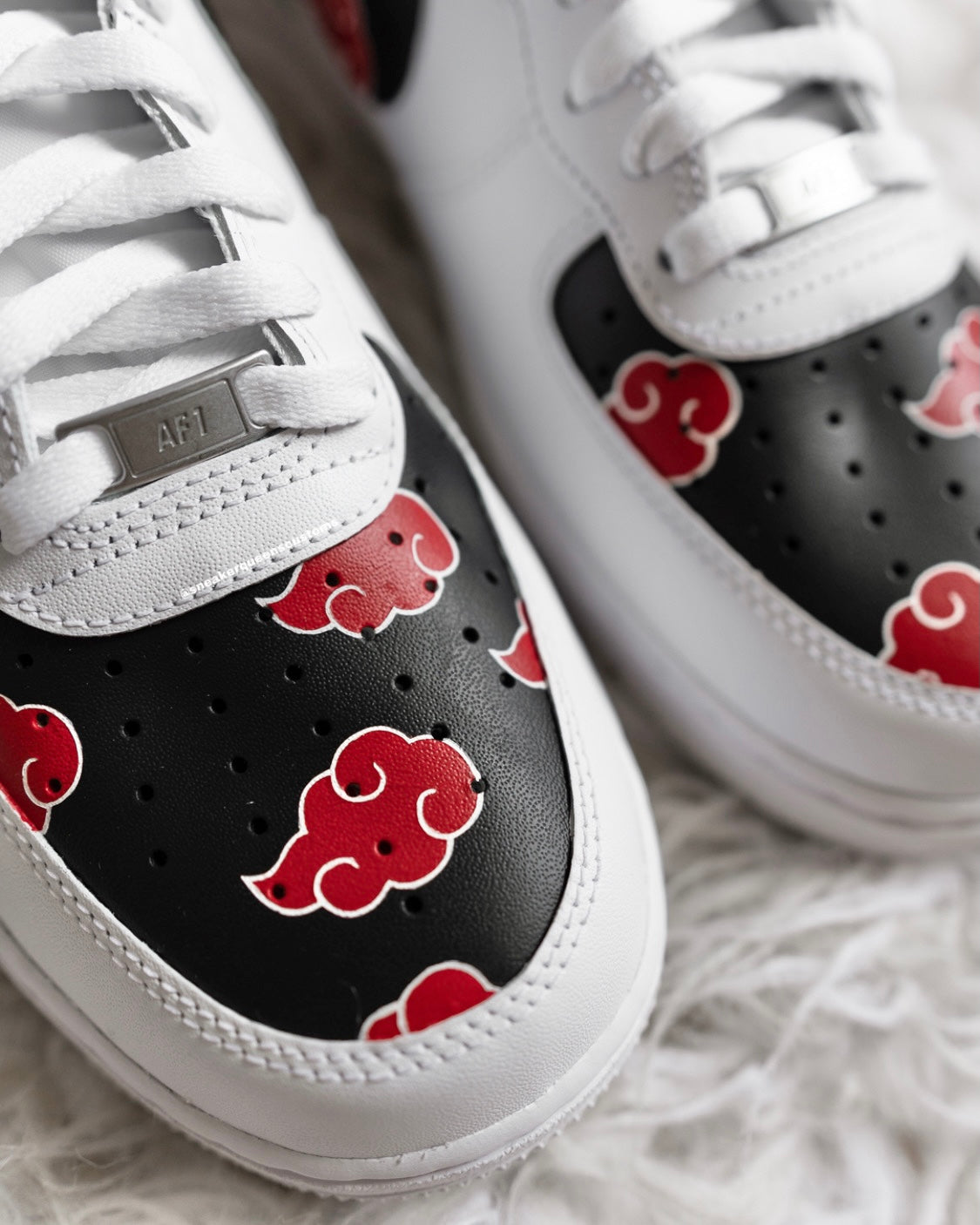 Anime-inspired white high-top sneakers featuring a distinctive red cloud pattern. Price includes both the shoes and custom artwork.