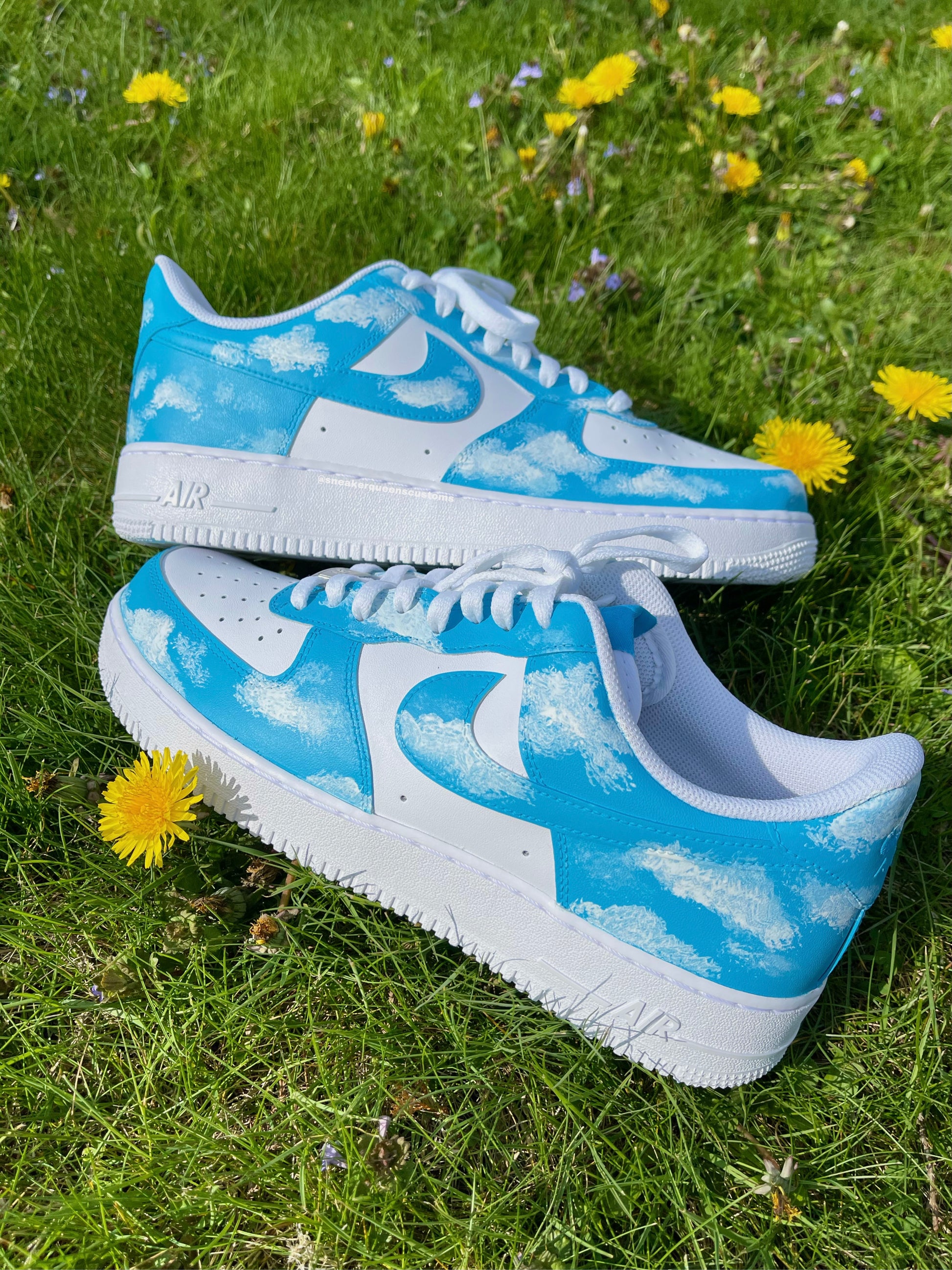 These custom AF1 low's are inspired by a warm summer day featuring a blue sky, with white puffy clouds throughout.