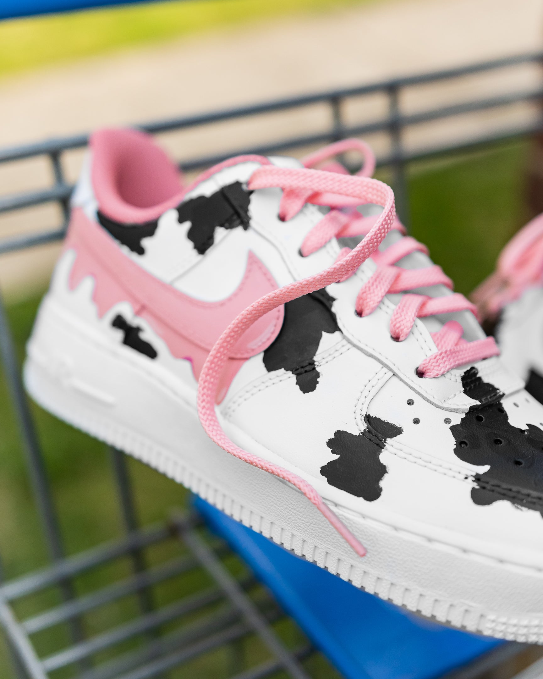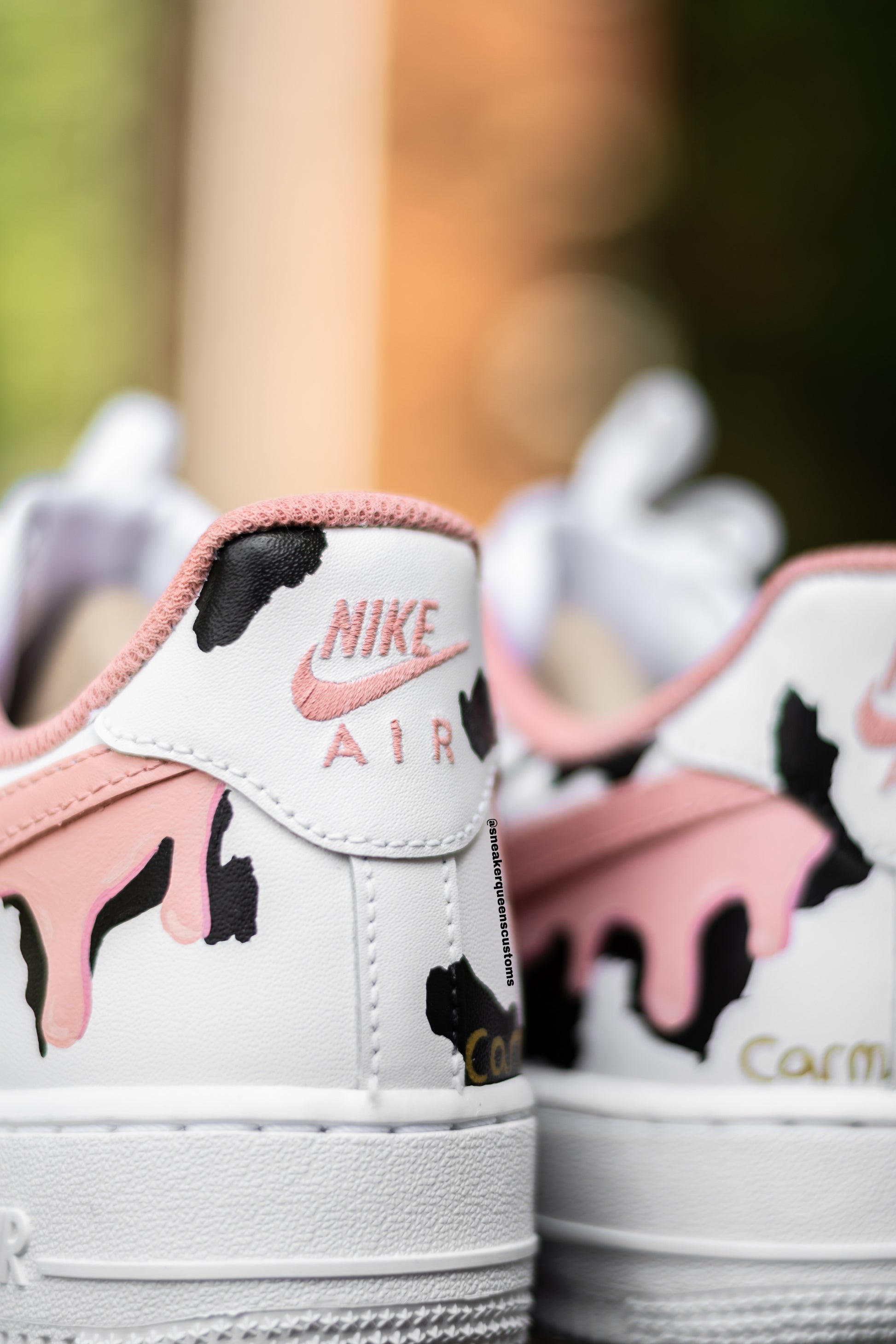 Strawberry milk inspired AF1 low's featuring pink dripping swooshes, pink laces and matching sock liners, with black cow print throughout.